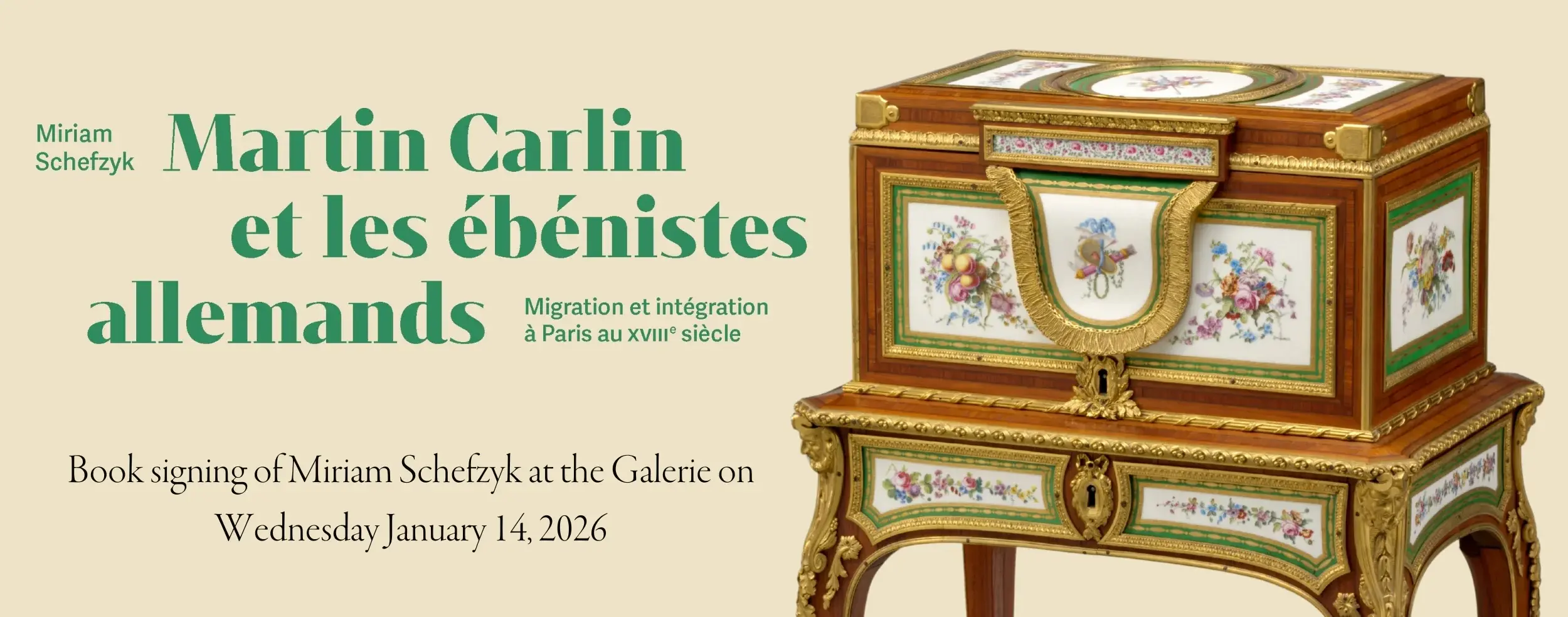 The Galerie Léage is delighted to welcome Miriam Schefzyk on January 14 for the signing of her latest book, “Martin Carlin et les ébénistes Allemands. Migration et intégration à Paris au XVIIIe siècle”. A reference work on this talented cabinetmaker, it highlights the genius of this artist, several of whose pieces of furniture are part of the Galerie’s collections.
