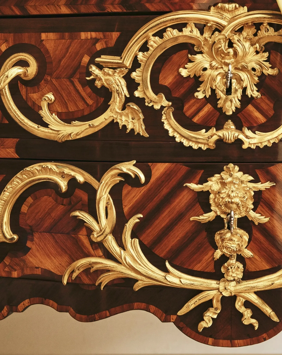 Despite the prohibition imposed by the guild of joiner-cabinetmakers against practicing two professions — and the disputes that followed — Cressent continued throughout his career to create the gilt-bronze mounts for his own furniture. He accorded them particular prominence, thereby distinguishing himself from his contemporaries. As a bronzier, he deployed remarkable inventiveness in the service of a powerful yet balanced rocaille taste. Floral ornaments, pierced clasps and scrolling foliage appear throughout his work. He developed several original motifs, such as the female busts known as “espagnolettes”, which adorn many of the corner mounts of his desks, as well as compositions featuring monkeys in a characteristically rocaille exoticism. Cressent also populated his mounts with fantastic creatures: between 1745 and 1750, a remarkable group of chests of drawers known as the “crossed palm and dragons” model was produced in his workshop.