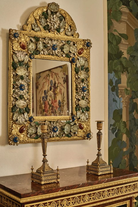 Several workshops distinguished themselves in the art of mirror making in Venice, among which that of Ettore Bigaglia was the most important in Murano at the end of the eighteenth century. He worked cristallo to produce glass plates as well as small molded ornaments. The inventory of his workshop, drawn up in 1714, records small vegetal ornaments in glass paste. His manufactory produced the most luxurious mirrors and was capable of supplying richly ornamented and complex works, comparable to this mirror from our collection. Combining a mirror plate with molded and colored glass vegetal ornaments, cut rock crystal drops, jasper cabochons, and a gilt and embossed copper frame, it exemplifies the most sumptuous creations of the period. The exceptional quality of its materials, together with the collaboration of multiple crafts—glassmakers, lapidaries, and goldsmiths—makes it a richly complex work, intended for the European elite.
