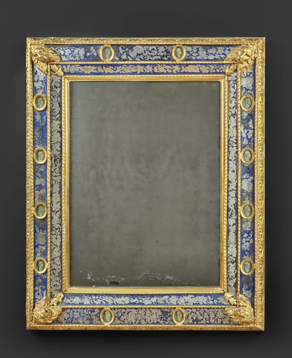 To enhance this precious material—one of Venice’s greatest sources of pride—artisans adorned it with sumptuous frames. Glass itself was often used in the framing. Colored, cut into fine plaquettes, or molded into complex shapes, it further increased the richness of the ensemble and distinguished Venetian production. Some craftsmen engraved mythological, allegorical, or pastoral scenes with a diamond point on the frame or directly onto the mirror surface, while others painted the glass or applied gold or silver leaf decoration using the technique known as verre églomisé.