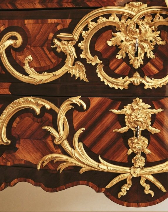 Charles Cressent, Commode à palmes croisées et dragons, détail, vers 1745–1750, galerie Léage