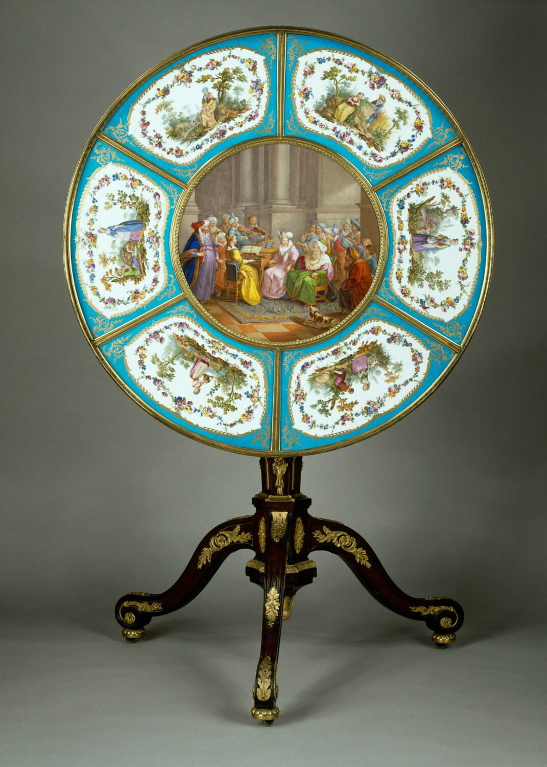 Outre les ustensiles et les services, la consommation du thé s’accompagne d’un mobilier spécifique. De nombreuses tables et guéridons à thé sont réalisés à la fin du siècle, dans lesquelles l’influence anglaise est perceptible. L’acajou est souvent le bois privilégié pour la réalisation de ces petites tables, dont l’un des exemples les plus riches est certainement celui exécuté en 1774 pour Madame du Barry. Ornée de sept plaques peintes de porcelaine de Sèvres, elle est réalisée par l’ébéniste Martin Carlin (1730−1785) sous la direction du marchand mercier Simon Philippe Poirier. Adam Weisweiler (1746−1820) développe quelques années plus tard un modèle doté d’un système de crémaillère permettant de relever le plateau central. Les convives peuvent ainsi disposer et accéder aisément à tous les éléments du service. Pour compléter ce mobilier dédié, de nombreuses petites tables volantes pouvaient également être utilisées par les consommateurs.