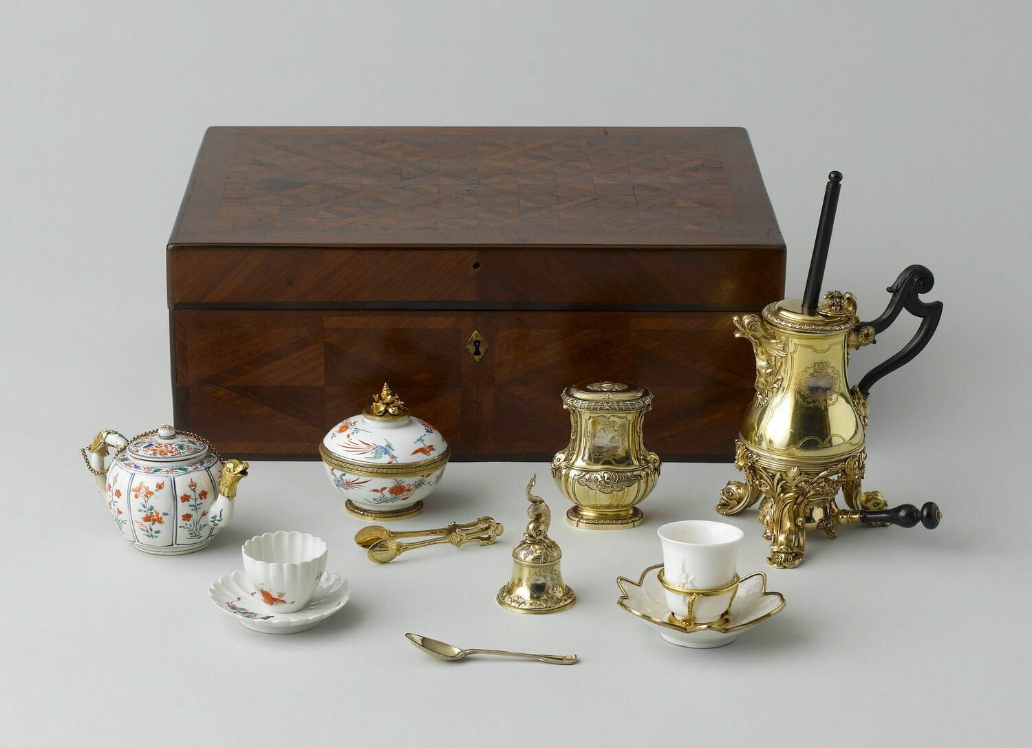 Consommé en Chine et au Japon depuis l’Antiquité, le thé parvient pour la première fois en Europe dans la première moitié du XVIIe siècle. Importé par les Compagnies orientales hollandaises et anglaises, il est particulièrement apprécié dans ces deux pays ainsi qu’à Paris. En 1687, Nicolas de Blégny, médecin ordinaire du roi, décrit dans son ouvrage Le bon usage du thé, du café et du chocolat, les prétendues propriétés médicinales du thé et la bonne manière de le consommer. À bord des navires des compagnies des Indes, tasses, soucoupes et théières accompagnent les cargaisons de thé en provenance d’Asie. Elles se retrouvent à Paris sur les tables raffinées, et sont indifféremment utilisées pour la consommation du thé, du café ou du chocolat. Le nécessaire de voyage offert par Louis XV à son épouse la reine Marie Leszczynska pour la naissance du Dauphin en 1729 comprend ainsi un sucrier et une théière en porcelaine du Japon, de petites tasses montées en trembleuses en porcelaine de Chine, une boîte et une passoire à thé en vermeil, accompagnées d’une chocolatière et d’une cafetière.