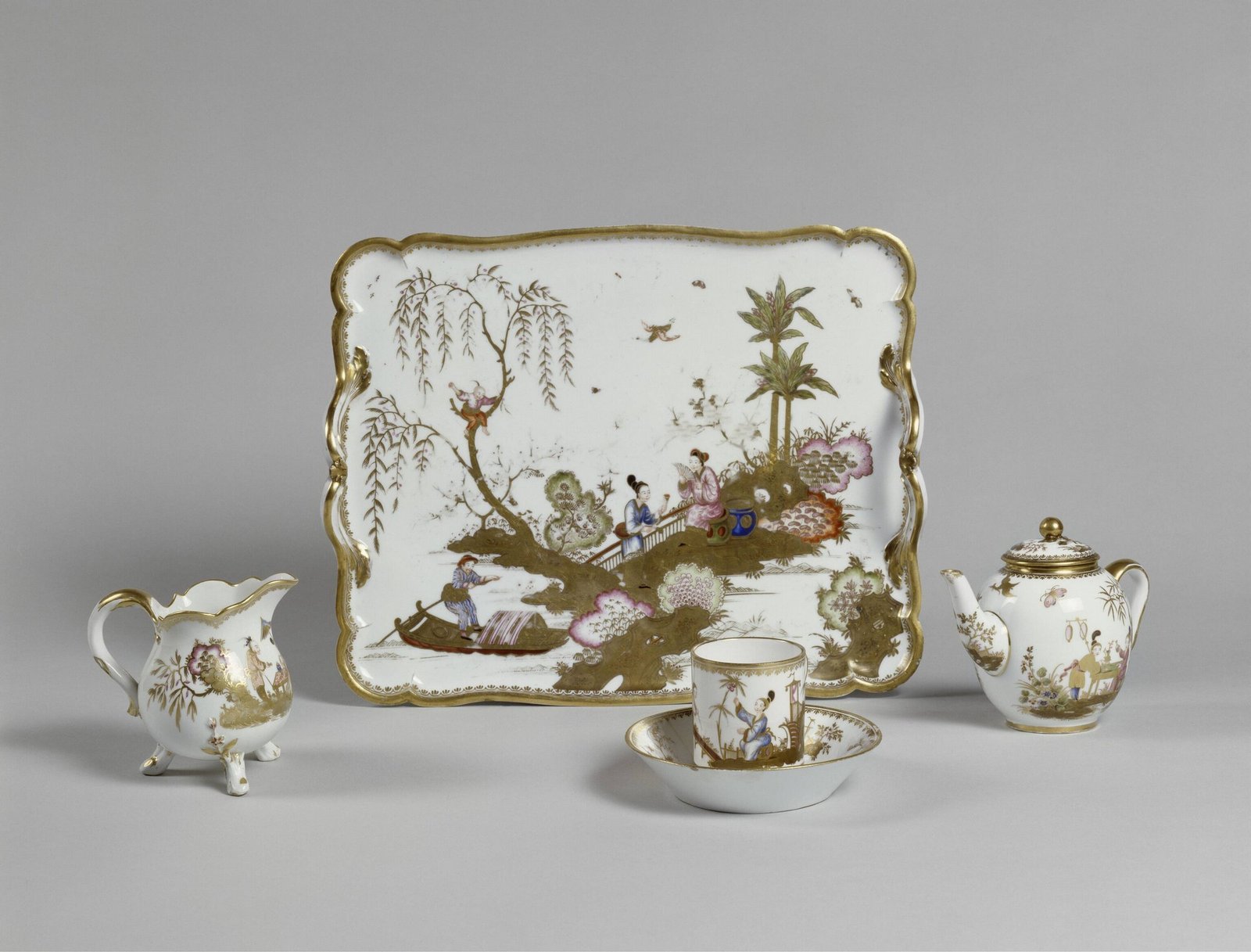 À mesure que l’usage du thé s’en répand en France, les ustensiles dédiés à sa consommation se multiplient et se spécialisent. Le mot « théière » se rencontre pour la première fois à la fin du siècle – Blégny parle encore de « pot » ou de « vaisseau » en 1687. Pour répondre à l’engouement pour les boissons chaudes, les manufactures de porcelaine européennes et notamment Meissen, Saint-Cloud, et Sèvres, rivalisent d’invention. Elles imaginent des tasses munies d’une anse, des soucoupes profondes, des théières, le tout décliné dans une grande variété de formes et de décors. Des ensembles peuvent être rassemblés sur un plateau en « déjeuners », qui renvoient à l’un des moments privilégiés de la dégustation du thé, l’équivalent du petit-déjeuner actuel. La famille royale est l’une des premières consommatrices de thé. Louis-Philippe, duc d’Orléans, acquiert en 1774 un déjeuner à sujets chinois auprès de la manufacture de Sèvres, comprenant une théière à roseaux que l’on peut reconnaître dans celle aujourd’hui conservée à Sèvres (inv. MNC 4670). Les souverains, mais aussi Mesdames, filles de Louis XV, possèdent également dans leurs appartements de précieux services à thé.