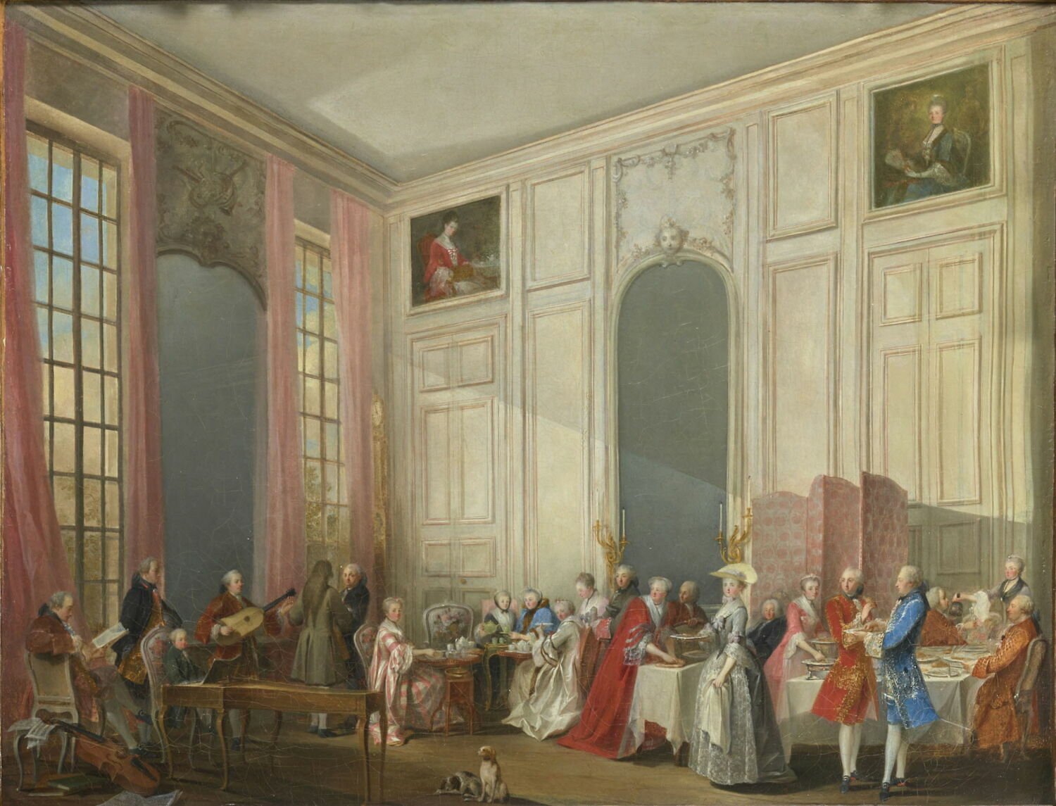 Particulièrement onéreux, le thé est réservé en France à la haute aristocratie, au sein laquelle son usage se répand dans la seconde moitié du XVIIIe siècle. Alliant exotisme et saveurs nouvelles, il reflète d’abord un intérêt curieux pour l’Empire du Milieu, son économie et sa culture. En 1761, la reine Marie Leszczynska dédie ainsi le programme iconographique de son Cabinet des Chinois à Versailles au négoce du thé. À partir des années 1760, sous l’influence de l’Anglomanie, le thé d’abord réservé à un usage intime s’impose comme un moment de sociabilité aristocratique. Le prince de Conti commande ainsi à Michel-Barthélémy Ollivier un tableau illustrant l’un de ses loisirs favoris, le Thé à l’anglaise servi dans le salon des quatre-glaces au Temple. Les convives, de qualité, se servent eux-mêmes du précieux breuvage. On reconnaît même, assis au clavecin, le jeune Mozart qui donne un concert pour le prince en 1764. Servi avec du lait, de la crème ou du sucre, pouvant être accompagné de gâteaux ou de pain, le thé devient la marque distinctive d’une aristocratie distinguée.