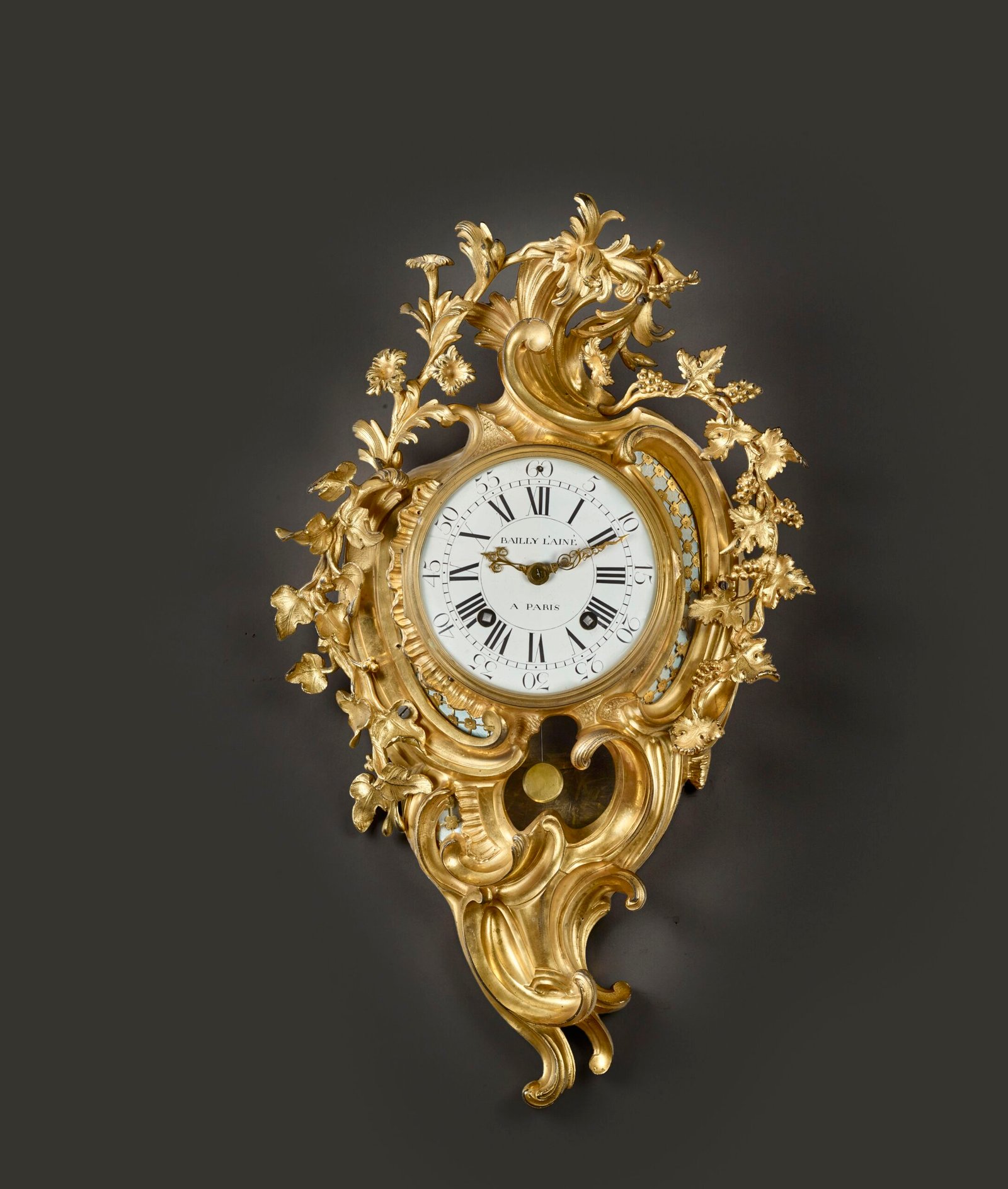 S’il s’est répandu dans toute l’Europe, dans certains pays son exubérance alla jusqu’à l’asymétrie où il fut alors qualifié par le terme de rococo. En France, il s’exprima d’une forme plus sobre où la symétrie resta de mise pour la forme générale des meubles ou des bronzes concernés. Ainsi, le bronze doré fut un terrain d’exploration particulièrement favorable à l’expression du vocabulaire rocaille allant parfois jusqu’à oser l’asymétrie des ornements, comme l’illustre ce cartel où mouvements et volutes sont asymétriques. La sobriété française est cependant mise à l’honneur pour le cadran central.